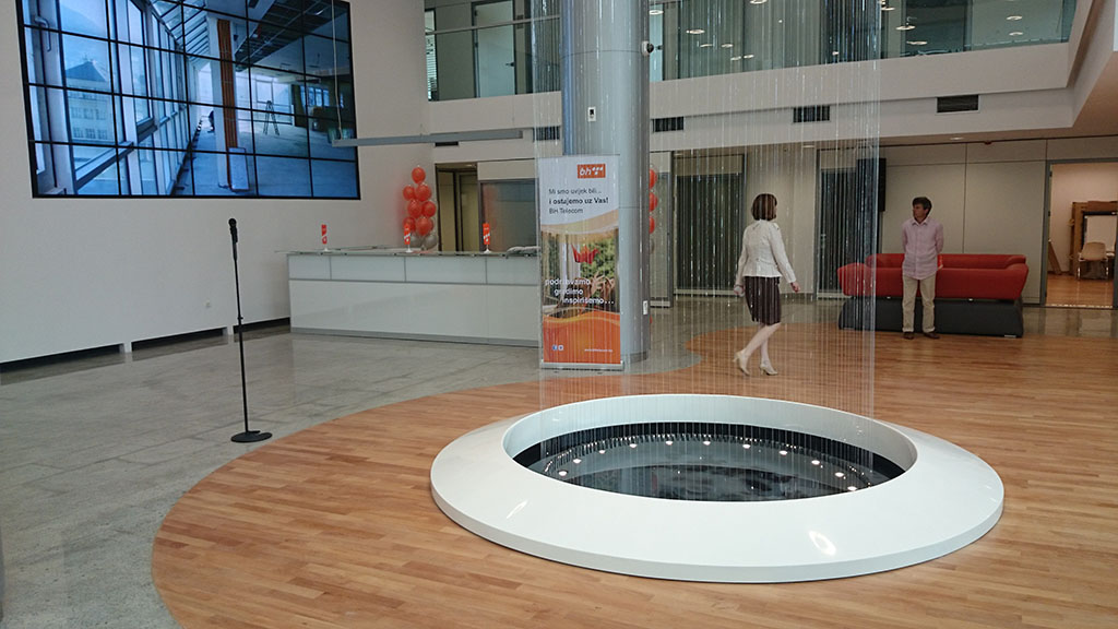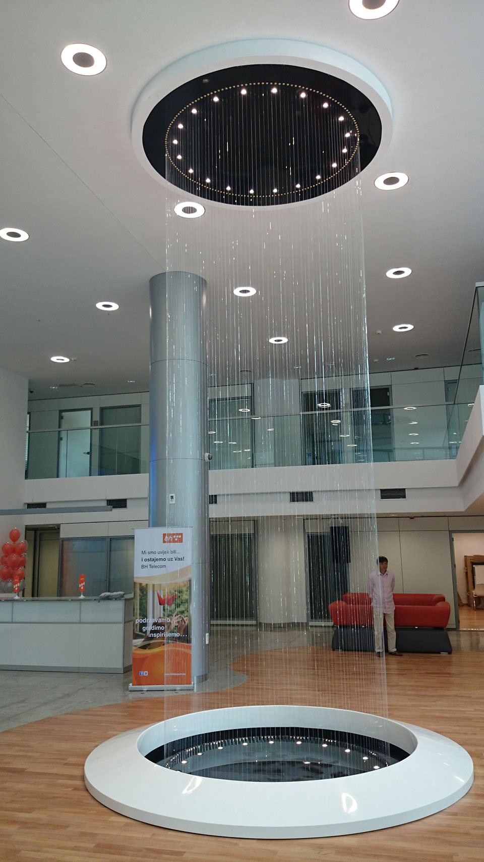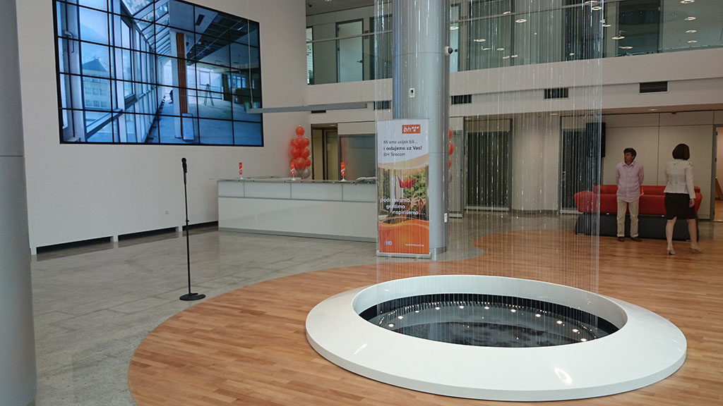 bhtelecom 004 bhtelecom 003 bhtelecom 002 bhtelecom 001 bhtelecom 009 bhtelecom 008 bhtelecom 007 bhtelecom 006 bhtelecom 005 bhtelecom 004 bhtelecom 003 bhtelecom 002Fontana VODENE NITI u novoj zgradi direkcije BHTELECOMA je jedinstvena jer osim vizuelne atrakcije poboljšava kvalitet zraka u prostoru jer filtrira zrak vodom te se prljavština odstranjuje preko filtera.